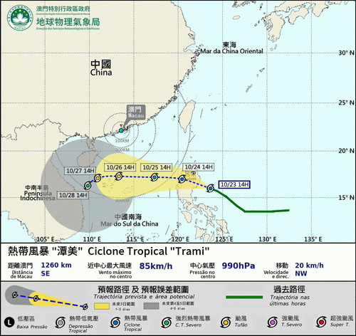 多地氣象部門預計位於菲律賓呂宋附近的熱帶氣旋「潭美」,未來數日會向偏西方向移動大致移向海南島一帶,不會吹襲珠三角地區;氣象局指按照現時預測路徑「潭美」將於周四下午至周五早上進入本澳800公里範圍。受東北季風共同影響下,預料本澳未來數日風勢較大,風力將維持六級或以上,周末期間雲量及驟雨會增多。