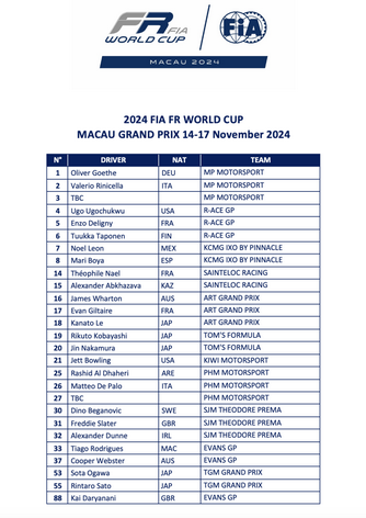 國際汽車聯會發佈最新來自世界各地的頂尖參賽車手名單,澳門格蘭披治大賽車組織委員會作為「國際汽聯FR世界盃賽」全球唯一主辦單位,國際汽聯FR世界盃將有來自15個國家及地區,包括澳洲、芬蘭、法國、德國、愛爾蘭、意大利、日本、哈薩克斯坦、澳門、墨西哥、西班牙、瑞典、阿聯酋、英國和美國的27名車手同場參賽。