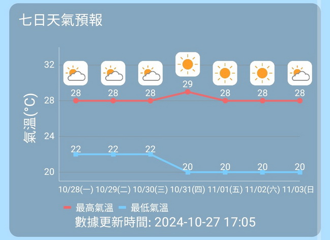 【本報消息】隨著秋颱「潭美」遠離,本澳周日早上一度放晴,但隨後轉為多雲天氣;氣象局預測本澳周初仍然較為多雲,但短暫時間會有陽光,周中起有乾燥的東北季候風補充屆時將更為乾燥,日夜溫差也會較大,最低氣溫會再次下降至約攝氏20度,但日間仍然會回升至28至29度。