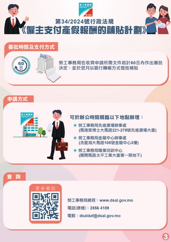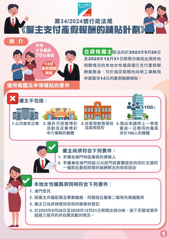【本報消息】為使僱主逐步適應產假日數的調升,並推動構建和諧的勞動關係,特區政府制定第34/2024號行政法規《僱主支付產假報酬的補貼計劃》,向支付產假報酬的僱主提供臨時性的補貼。