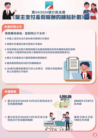 按照行政法規的規定,合資格僱主依法向於2023年5月26日至2025年12月31日期間分娩的本地女性僱員支付70日產假報酬後,可於僱員分娩之日起計150日內向勞工事務局提出申請,可獲發相等於僱員14日基本報酬的補貼;如屬2024年10月29日前分娩且已全數支付產假報酬的情況,相關的僱主則須於2025年1月27日前提出申請。