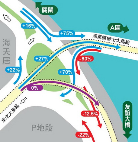 另一方面,當局指考慮到澳門大橋開通後,現時由友誼大橋經友誼圓形地轉往A區的車流有所減少,而路氹往返人工島的交通路徑基本由友誼大橋轉移至澳門大橋,新路徑較經友誼大橋縮短約三里,行車時間預計節省約三至六分鐘。根據統計,澳門大橋10月下旬的日均車流量約20,000標準車(PCU)。