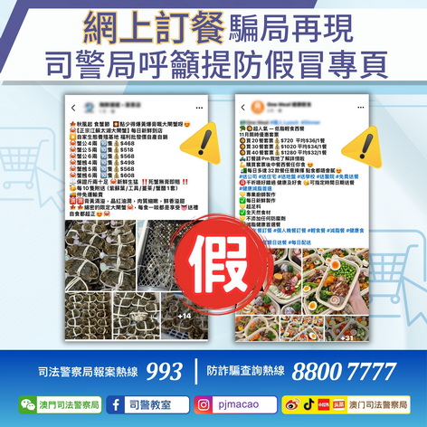 鑑於早前本澳曾發生類似手法的騙案並造成多名市民損失,司警局反詐騙協調中心再次呼籲市民切勿貿然與陌生網上帳號進行交易,尤其訂購餐品,應選擇具有實體門店的商戶;網購需謹慎,小心防範各類型「先付款、後送貨」的交易要求;倘懷疑涉詐,可使用司警局反詐程式查核風險指數,又或致電防詐騙查詢熱線8800 7777或報案熱線993求助。