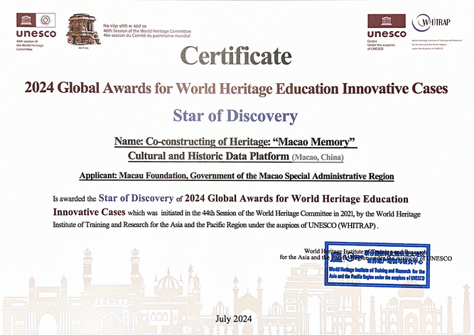 【本報消息】澳門基金會的澳門記憶文史網繼於七月獲2024年《全球世界遺產教育創新案例獎》的十大「探索之星獎」後,再於11月7至8日由聯合國教科文組織亞太地區世界遺產培訓與研究中心、杭州城研中心浙江省城市治理研究中心以及浙江省文物保護利用協會聯合舉辦的 2024世界遺產創意Í創新者大會上,獲得「全球世界遺產教育創新案例獎」。