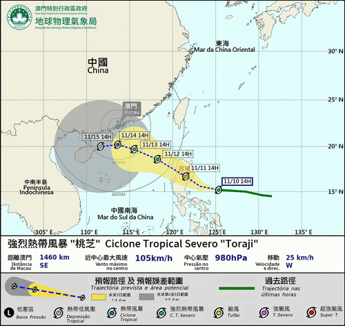 【本報消息】11月還打風?繼熱帶氣旋「銀杏」在周末假期為本澳帶來三號風球後,熱帶氣旋「桃芝」和「萬宜」也於周末相繼形式,本澳氣象局預料「桃芝」未來兩日會以西北方向移動越過呂宋島並進入南海,周一後期至周二初時進入本澳800公里範圍,屆時將視乎情況考慮發出風球,根據當局目前預測的路徑,「桃芝」將於周三至周四左右最接近本澳,並且可能較「銀杏」更接近珠江口一帶。