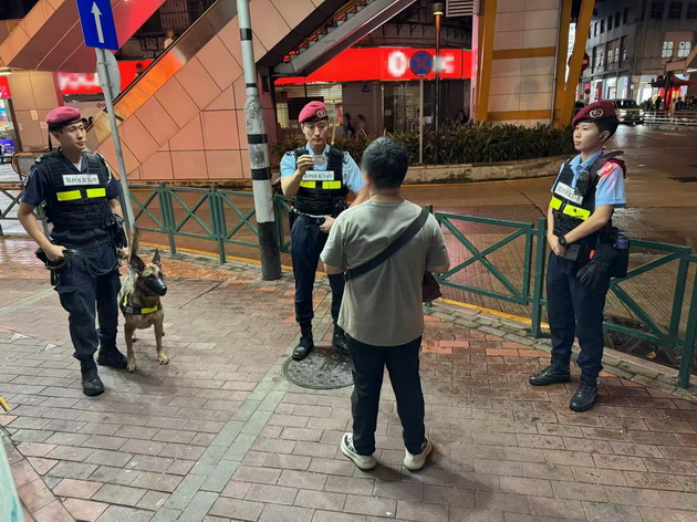 【本報消息】在警察總局統籌下,治安警察局於13日持續開展「雷霆2024」行動,以維護本澳良好治安環境。治安警察局轄下澳門警務廳、海島警務廳、交通廳、情報廳、特警隊及轄下警犬組共派出75名人員,分別巡查多間按摩場所,同時在澳門各區、氹仔市區及路氹城金光大道一帶加強截查可疑人士,並進行不定點查車行動,以預防及打擊各種不法行為和犯罪活動。