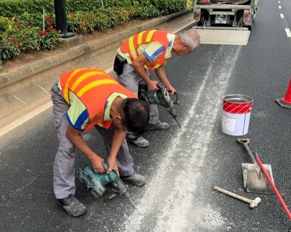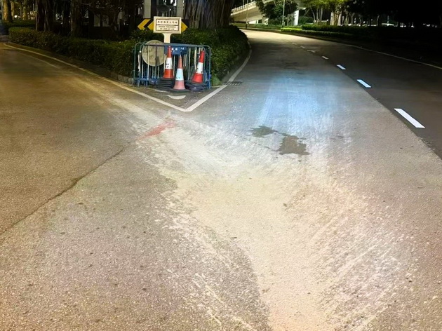 市政署已派員跟進清理,對受油漆污染的混凝土路面進行清洗,以盡快恢復路面行車。而部分受水泥漿影響的瀝青路段,則需以手提機具開鑿刨刮去除水泥硬塊,使用黑色馬路漆作覆蓋性緊急維修,以恢復路面、標線及道路標記的清晰度,初步已完成排險性清理工作。但因受污面積大且水泥漿已凝固難全部清除,為確保路面的安全性,市政署將與交通部門協調後續修復安排。
