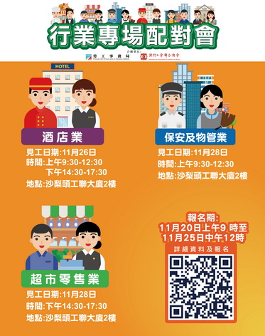 【本報消息】勞工事務局與工聯總會合作於11月底再舉辦三場行業專場配對會,合共提供502個空缺。報名日期由11月20日上午九時至25日中午12時。