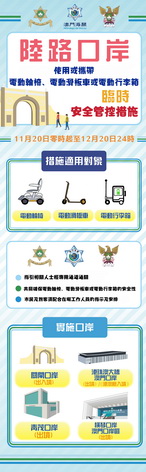 在此期間,市民及旅客使用或攜帶電動輪椅、電動滑板車或電動行李箱,經關閘口岸出、入境通關,或經港珠澳大橋澳門口岸出、入境(僅指由港來澳)通關,又或經青茂口岸及橫琴口岸澳門口岸區出境通關時,將由海關、治安警及消防局人員共同確保使用或攜帶上述物品之人士在安全情況下通關。