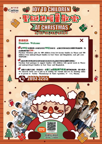 【本報消息】為讓更多小朋友分享聖誕節的喜樂,澳門明愛今年繼續舉辦「2024聖誕送暖童歡樂」活動,透過各界捐助善款,為本澳及東帝汶、孟加拉有需要的兒童帶來溫暖。活動將於12月31日結束,敬請市民踴躍參與,向受惠小朋友送上愛心與關懷。