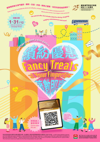 「繽紛優惠 著數即享」線上宣傳平台匯聚來自各綜合度假休閒企業、本地中小企及交通運輸業的商號專為慶祝澳門回歸25周年所推出的優惠,目前有超過450項,其中餐飲約280項;優惠涵蓋餐飲、購物、住宿、休閒娛樂及門票等多個領域,讓澳門居民和旅客輕鬆掌握優惠訊息,旨在為充滿節慶的12月促進消費,尤其透過中小企的優惠項目,在消費過程中促進社區旅遊,發揮疊加效應。