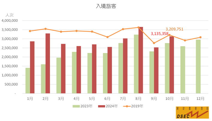 10月台灣旅客68,701人次按年上升28%,香港旅客590,930人次則減少0.2%。該月香港旅客較2019年同期增加4.1%,內地及台灣旅客也分別回復至2019年同期的96.6%及81%。