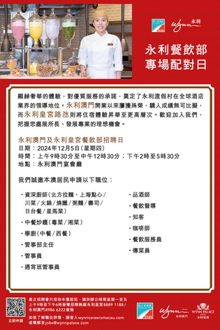 12月5日餐飲及廚藝部專場配對會報名日期由11月27日上午九時至12月4日中午12時;12月17日市場業務部專場配對會報名日期由12月4日上午九時至13日中午12時;兩場配對會均在永利澳門宴會廳舉行。