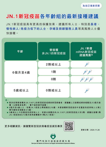 衛生局呼籲所有人士,特別是高風險人士,包括長者、患有慢性疾病或免疫力較低的人士、孕婦及前線醫護人員儘快接種,以降低感染後出現重症和死亡的風險,欲接種人士可由即日起透過鏈結(eservice.ssm.gov.mo/covidvacbook)預約,JN.1新冠疫苗接種對象為六個月或以上人士。
