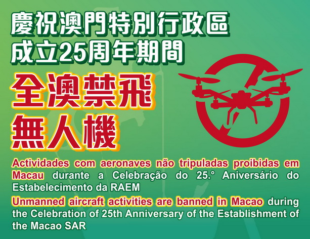根據第43/2021號行政命令核准之《澳門空中航行規章》第66條的規定,民航局將於12月14日至22日期間實施全澳禁飛無人機,以確保澳門特別行政區成立25周年慶祝活動的順利和安全進行。