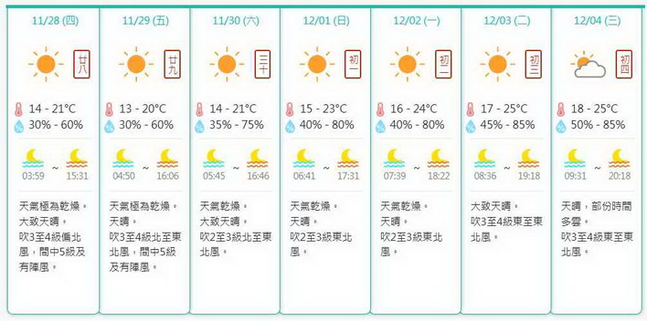 展望下周初期,東北季風將會逐漸緩和,氣溫緩慢回升,但早晚天氣仍然清涼。