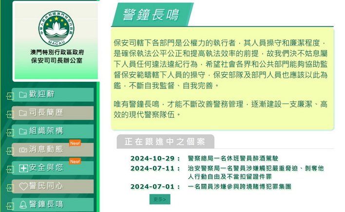 另外,對於傳媒問及如何評價「警鐘長鳴」措施成效時,他指在保安司司長辦公室網頁設立「警鐘長鳴」專欄,以及公佈紀律程序進展並非法律要求,保安司主動公佈個案和紀律程序數量或進展情況,表現警方主動承擔、敢於面對解決問題,並且接受社會監督,強調這是一種勇氣和承擔。