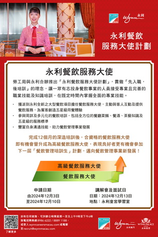 【本報消息】為配合澳門「創意城市美食之都」發展,培養及儲備更多澳門餐飲人才,勞工事務局和永利澳門合作推出「永利餐飲服務大使計劃」,以「先入職、後培訓」方式,為有志投身綜合休閒旅遊服務行業餐飲事業的澳門居民提供全方位培訓及發展階梯,計劃由12月3日起接受申請。