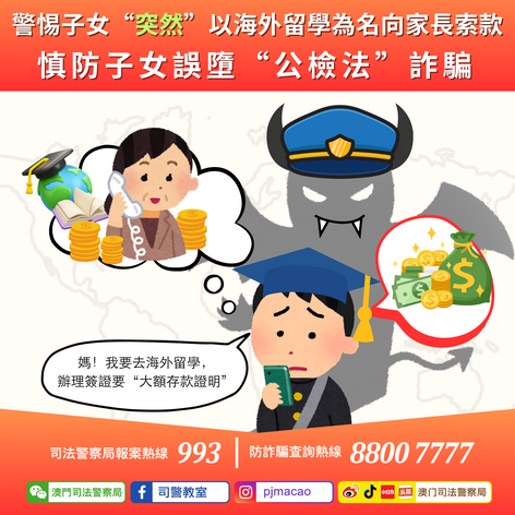 【本報消息】近日司警局接獲數名家長檢舉,報稱早前正在海外升學的子女,因即將前往其他國家留學,辦理簽證需「大額存款證明」為由,向家長索取巨款。家長未經深入了解,貿然向子女匯出款項,而子女收取款項後,隨即匯予騙徒。惟事後家長才發覺子女誤墮「公檢法」電話詐騙,招致巨額財產損失。