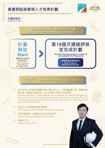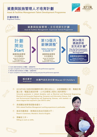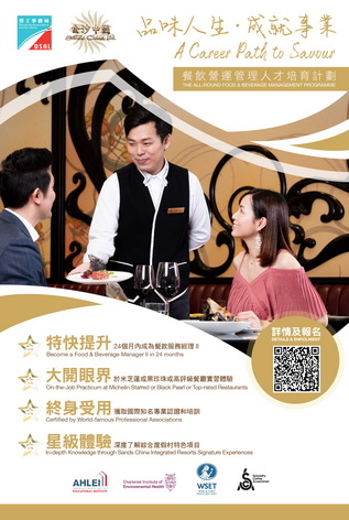 【本報消息】為支持本地人才全面發展,拓展多元職涯路向,勞工事務局和金沙中國合作推出「資產與設施管理人才培育計劃」及「餐飲營運管理人才培育計劃」,以「先入職、後培訓」方式,為有志投身綜合旅遊休閒服務行業的澳門居民提供全方位培訓及事業發展機會,計劃由12月10日起接受申請。