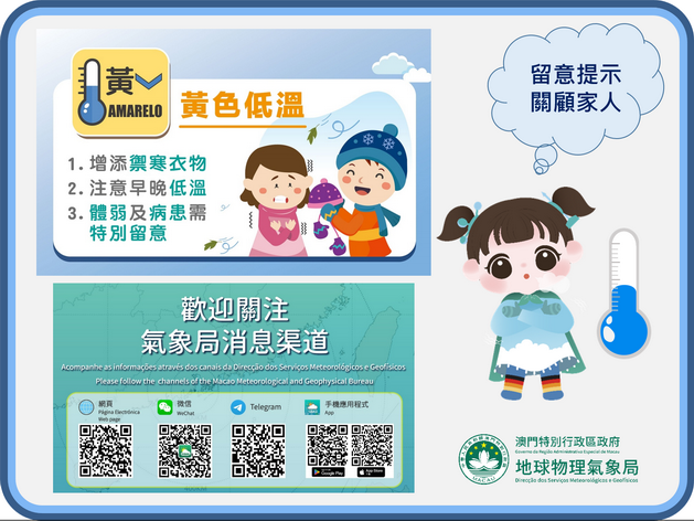 氣象局又提醒,按現時模式的資料預測,本月中下旬冷空氣將轉趨活躍,更強的冷空氣將會南下,氣溫或會進一步下降。提醒巿民應持續關注局方最新天氣預測及提示,並為可能出現的氣溫變化及早做好準備,尤其需要關注長者、小孩及體弱人士的身體健康。