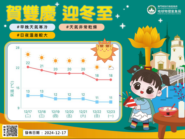 本澳即將迎來回歸25周年紀念日、冬至及聖誕節長假期,氣象局預料未來數日東北季風將持續影響本澳,周五回歸日及周六冬至早晚天氣寒冷,天氣會持續天晴及非常乾燥,最低氣溫介乎11度至12度左右,日夜溫差較大,日間最高氣溫會回升至約18度至20度。