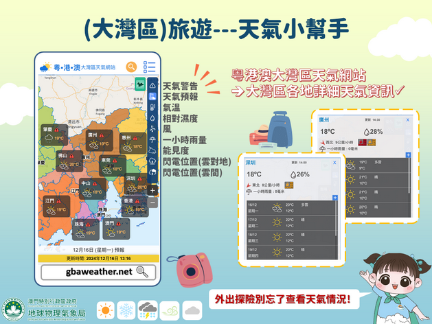 氣象局展望下周聖誕節假期冷空氣仍持續活躍,早晚天氣寒冷,普遍天晴及非常乾燥;當局並特別為已計劃在長假期外遊的市民推介天氣網站,以便獲得最可靠的旅遊目的地天氣資訊。市民如到大灣區旅遊,可以瀏覽由廣東省氣象局、香港天文台、澳門地球物理氣象局三地共同合作,提供灣區主要城巿的天氣資訊及天氣警告的粵港澳大灣區天氣網站www.gbaweather.net/tc/index.html。