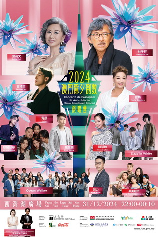 由文化局主辦,旅遊局、市政署等多個部門及機構協辦的「2024澳門除夕倒數演唱會」,將於12月31日晚上10時至零時10分在西灣湖廣場舉行,參與表演的澳門和香港本地歌手及樂隊包括肥媽、古淖文、陳慧敏、龍世傑、倪力、青原、Daze in White、Ocean Walker、英美超市、歐陽日華與DAX One Dance Complex等,香港著名歌手林子祥、葉蒨文則將作壓軸演出嘉賓,為觀眾獻上激勵人心的經典歌曲,演唱會由香港知名主持人王鎮泉及2019年澳門小姐冠軍梁洛郗聯袂擔任司儀,與觀眾在歡欣熱鬧的環境下迎接2025年的到來。