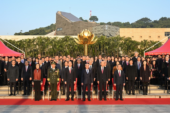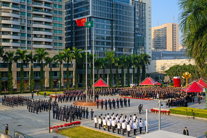此外,特區政府於早上八時在金蓮花廣場舉行隆重的升旗儀式,慶祝澳門回歸祖國25周年。行政長官岑浩輝在保安司司長黃少澤陪同下檢閱儀仗隊及接受敬禮。中央人民政府駐澳機構負責人、澳門特區立法及司法機關負責人、行政會委員、立法議員、特區政府官員、澳區人大代表、政協委員及社會各界人士等約740人。