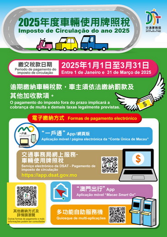 【本報消息】交通事務局表示,2025年度車輛使用牌照稅(行車稅)由2025年1月1日至3月31日期間徵收,市民可透過交通局網上服務、一戶通App/網頁版、澳門出行App、多功能身份證明局自助服務機,或親臨交通局、市政署或財政局轄下指定地點繳納稅款。