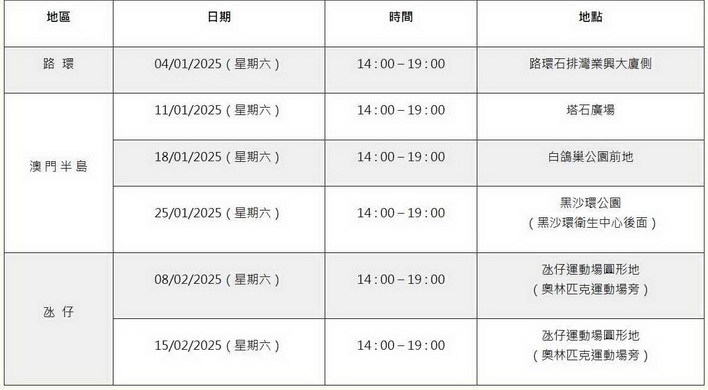 犬隻准照申領及續期流動服務站舉辦地點包括路環石排灣業興大廈、塔石廣場、白鴿巢公園前地、黑沙環公園及氹仔運動場圓形地,流動站亦將新增領養查詢攤位,便利有意領養人士瞭解待領養動物資料及領養前準備事項。