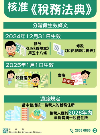 配合核准《稅務法典》30日公佈實施,首階段修改《印花稅規章》第58條有關繳納財產移轉印花稅及修改《印花稅繳稅總表》之規定從2024年12月31日起生效。稅務居民的界定及表格的新規定,則將於2025年1月1日起生效。