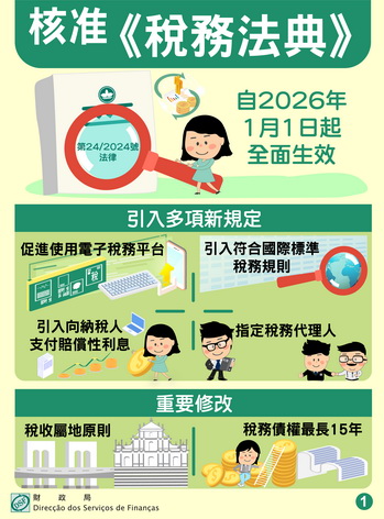 核准《稅務法典》自2026年1月1日起全面生效。相關過渡規定,包括統一納稅人的稅務住所,自2026年1月1日起計一年內,納稅人應向財政局告知或變更其獨一稅務住所。如有疑問,可致電財政局稅務查詢熱線2833 6886。