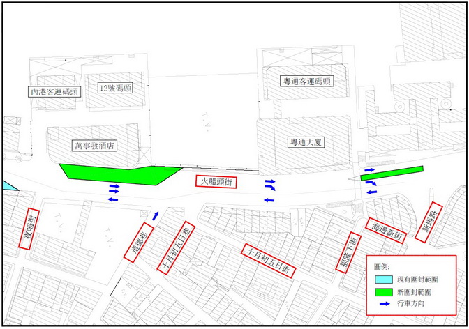 最新局部圍封的新馬路與火船頭街交匯處亦已開挖,施工方將在該交匯處將進行局部重鋪路面;由於該處封路佔用馬路中線,除了令原有三線減至二線外,車輛由火船頭街直行往巴素打爾古街需靠最左車道行駛,右轉往新馬路則需要靠最右側車道行駛。