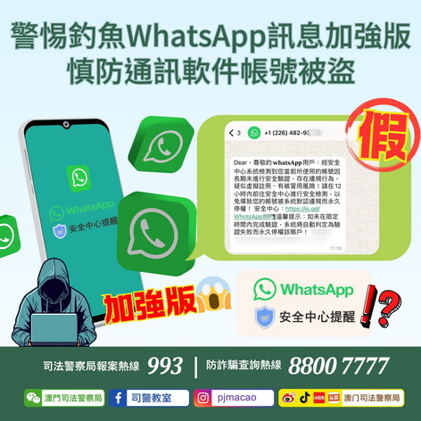 【本報消息】司警局近日發現盜用WhatsApp帳號出現新手法,有別於過往騙徒隨機向市民大量濫發SMS短訊,新手法中騙徒改為透過WhatsApp直接發送詐騙訊息予市民,訛稱市民帳號涉及違規即將被停權,要求市民馬上點擊訊息內附帶之釣魚連結「完成驗證」,當用戶點擊後將跳轉至另一個由騙徒使用之WhatsApp聯絡人,並向市民提供一串含有六位數字的代碼,要求市民在自己手機之WhatsApp軟件中輸入;倘市民按對方要求輸入上述代碼,其帳號將馬上被騙徒在其他地方登入;騙徒以此手法成功盜取市民WhatsApp登入權限後,將會用作詐騙市民親友或其他不法用途。