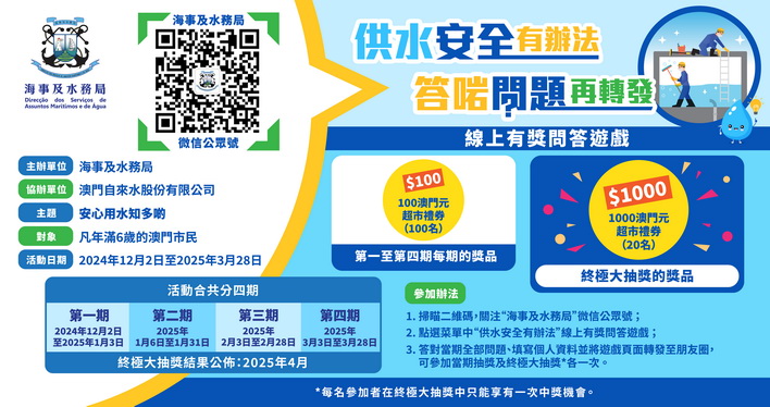 樓宇自來水系統是食水供應的最後一環,業主和物業管理實體必須做好維護管理工作,市民才能享有潔淨食水,不會浪費千里而來的珍貴淡水資源。為進一步加強公眾對樓宇自來水系統維護管理的認識,海事局推出「供水安全有辦法」線上有獎問答遊戲,由即日起至3月28日分四期進行,首期活動共吸引了4,597人參加,第二期活動由即日起至1月31日截止,有興趣的市民可到海事局微信公眾號參與活動和了解詳情,有機會獲得超市禮券。