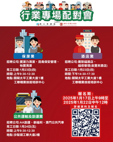 1月24日上午舉辦公共運輸及旅運業配對會,招聘公司是「AA旅遊有限公司」、「澳門新福利公共汽車有限公司」及「澳門公共汽車股份有限公司」,三間公司合共提供47個職位空缺,涉及車長、站長、安全督導員及客戶服務助理。配對會在工聯總會二樓(沙梨頭海邊街2-6號工聯大廈)舉行。