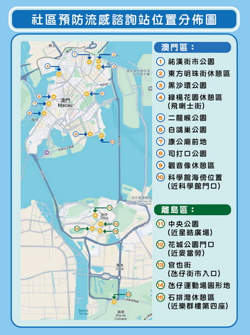 「社區預防流感諮詢站」開放時間為1月18及19日下午一時至五時,15個地點包括澳門區的祐漢街市公園、東方明珠街休憩區、黑沙環公園、綠楊花園休憩區(飛喇士街)、二龍喉公園、白鴿巢公園、康公廟前地、司打口公園、觀音像休憩區、科學館海傍位置(近科學館門口);離島區的中央公園(近星皓廣場)、花城公園門口(近麥當勞)、官也街(氹仔街市入口)、氹仔運動場圓形地和石排灣休憩區(近樂群樓第四座)。
