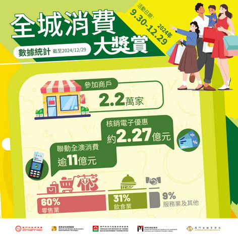 活動參與商戶約2.2萬間,電子優惠總核銷金額約2.27億元,聯動全澳消費逾11億元。受惠商戶遍佈全澳不同行業,零售業約佔60%、餐飲業約31%,服務業及其他行業約9%。活動期間,獲559間商戶響應同步疊加提供額外消費優惠,齊心合力帶動社區消費。