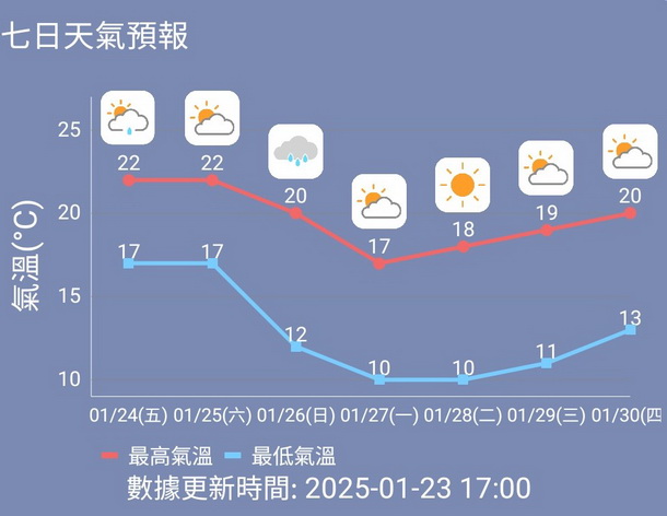 下周三大年初一本澳天氣仍然寒冷及極為乾燥,且雲量會有所增加,最低和最高氣溫均會稍微回升至一度至11度至19度,受季候風持續影響,下周中後期天氣仍然清涼。