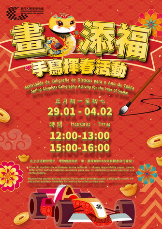 旅遊局轄下的澳門大賽車博物館在新春期間包括2月4日星期二(大年初七)定休日照常開館,又於1月29日至2月4日舉辦 「畫蛇添福」手寫揮春活動。至於跨年活動「2024幻彩耀濠江」,在新春期內的特定時間安排春節主題工作坊和限定表演等快閃活動,與居民及旅客共度新歲。