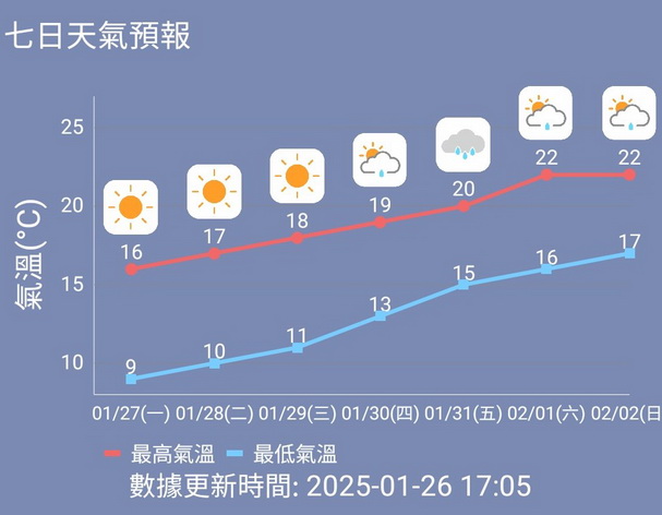 展望周中這股寒冷的季候風將會減弱,本澳會轉受偏東氣流影響,逐漸回暖及轉為多雲有雨;預測周四年初二多雲和短暫時間有陽光,稍後有幾陣雨,氣溫約為13度至19度,相對濕度介乎60%至95%之間;周五年初三氣溫進一步上升至15度至20度,大致多雲並有幾陣雨。周末至下周日氣溫約為16度至22度,多雲短暫時間有陽光,並有幾陣微雨,下周日早晚有薄霧。