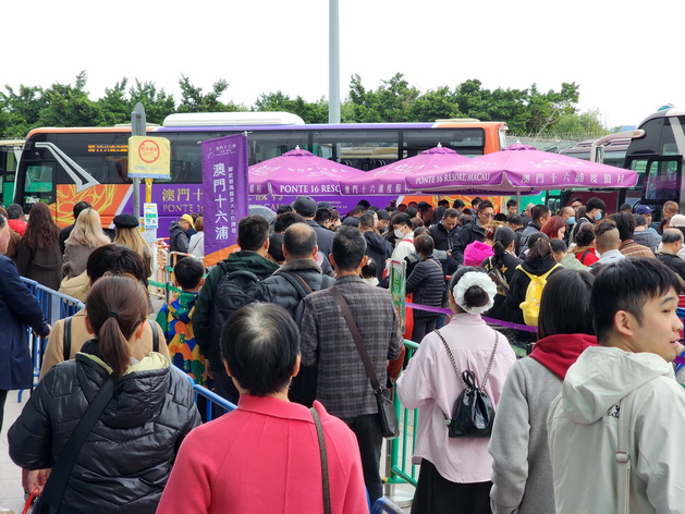 周一年初六雖然已進入春節黃金周假期倒數第二天,但早上入境本澳的旅客人流仍然非常多,其中關閘口岸入境旅客人頭湧湧,巴士、的士和酒店穿梭巴士的運力繼續受到考驗,至午後入境人流始有所減少,巴士站多條熱門線路的排隊人龍已經疏導,在現場排隊的人數大減;的士站雖然有旅客排隊等候上車,但人龍不算長,的士也一輛接一輛陸續按序靠站讓乘客上車;酒店穿梭巴士方面,除了部分前往中區的免費穿梭巴士站,現場有數百人排隊「打蛇餅」,等候時間需要超過半小時以上外,其餘酒店穿梭巴士在加大運力下只有約數十人排隊,基本上無需長時間等候就能上車。