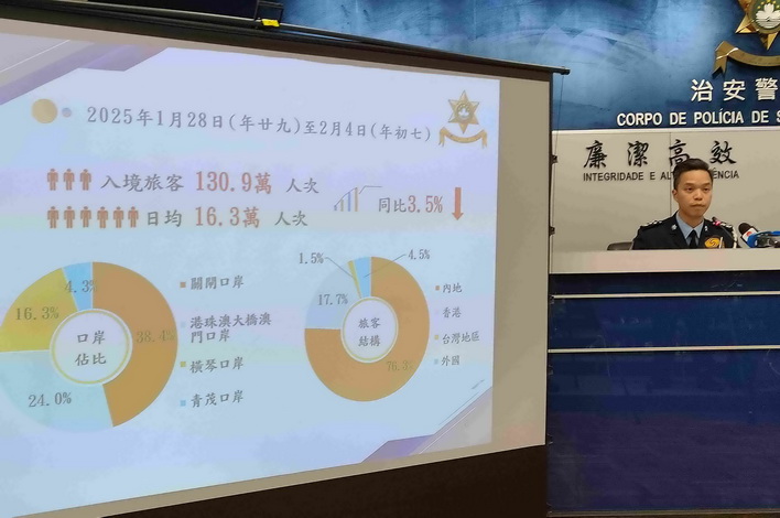 【本報消息】治安警總結新春警務工作,出入境管制廳廳長劉家榮在公佈數據時表示,由年廿九至年初七的內地春節黃金周期間(1月28日至2月4日),本澳各口岸總出入境共錄得491.8萬人次,日均61.4萬人次,同比上升0.6%。