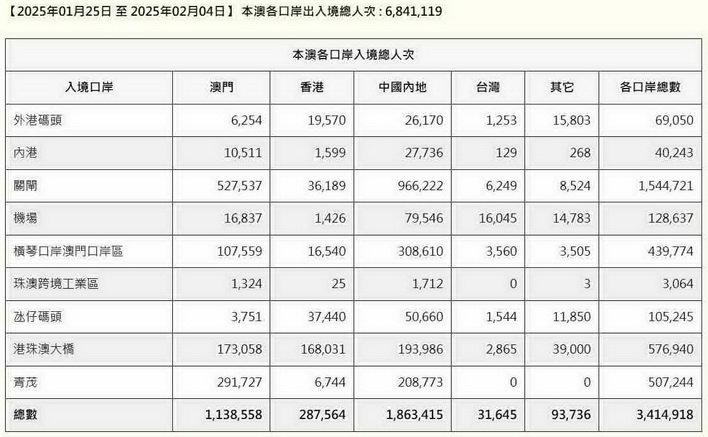 同時,隨著澳車北上、橫琴單牌車等政策實施與新春效應疊加,新春假期各陸路口岸以車輛通關的客量也錄得明顯升幅,達43.4萬人次,同比增加15.1%。海空口岸方面,澳門國際機場出入境客量為18.6萬人次,佔全澳3.8%;氹仔碼頭為15.7萬人次,佔全澳3.2%;外港碼頭為9.6萬人次,佔全澳2%;內港碼頭為5.4萬人次,佔全澳1.1%。