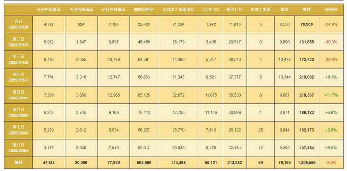 此外,由除夕至大年初二(1月28日至30日)連續三天的訪澳旅客數字均錄得按年下跌,跌幅介乎19.3%至34.9%;不過由大年初三至初七(1月31日至2月4日)則連續五天錄得訪澳旅客按年上升,升幅介乎3.8%至11.7%。
