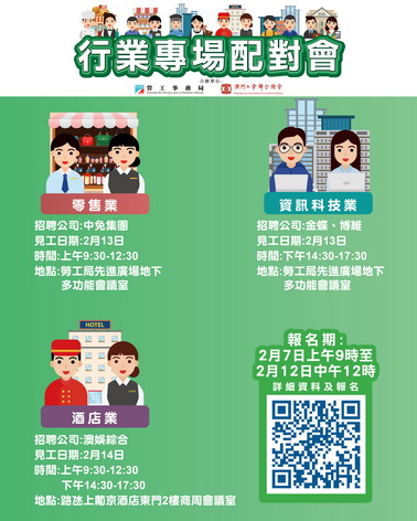 2月13日上午零售業專場配對會及下午資訊科技業專場配對會在勞工局地下多功能會議室(馬揸度博士大馬路221-279號先進廣場大廈)舉行;2月14日全日酒店業專場配對會在上葡京二樓商周會議室舉行。報名日期由2月7日上午九時至12日中午12時。