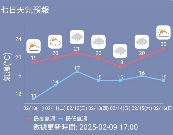 當局預料本周後期會有較弱的冬季季風影響本澳,周四氣溫略降,初時有幾陣雨和薄霧,吹微風,後轉三至五級北至東北風及有陣風,氣溫會由初時最高的約20度,降至最低的約15度。展望周末氣溫約為15度至20度,多雲並且有幾陣雨。根據氣象局七日天氣預測,下周日降雨會暫停並且部份時間有陽光,氣溫會進一步上升至15度至22度。