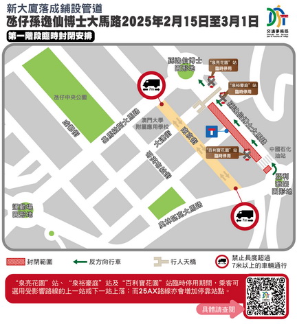 【本報消息】因應有新大廈落成須進行工程連接管道,介乎亞利雅架圓形地與孫逸仙博士圓形地的一段氹仔孫逸仙博士大馬路自2月13日起實施臨時交通措施,並於2月15日至3月15日期間分階段實施封閉交通,24條巴士線受影響。