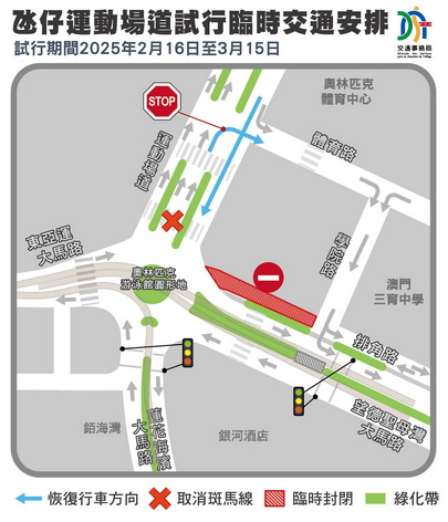 有見及此,交通局將於2月16日至3月15日試行臨時恢復運動場道雙向來回,包括運動場道恢復右轉前往體育路、學院路路口;恢復往游泳館圓形地行駛方向;取消近游泳館圓形地行人斑馬線;同步封閉排角路往運動場道的路口。因此,由學院路經排角路往氹仔市區的車輛需繞行望德聖母灣大馬路及地堡街方向。